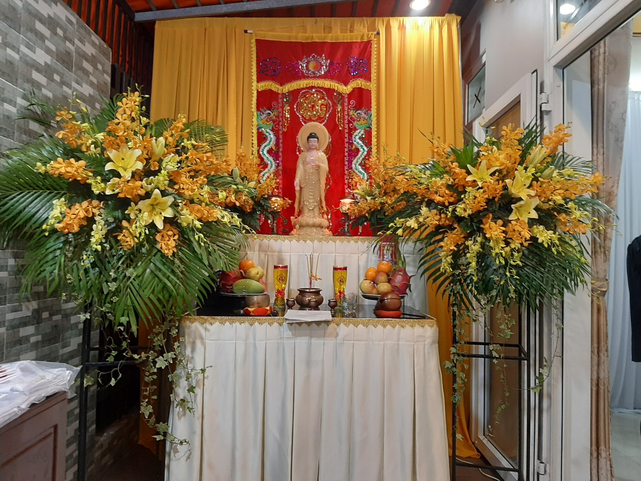 - Đồ trang trí sảnh tang lễ: bàn Phật, bàn Vong, màn lộng trang trí, thùng phúng điếu, trụ đèn trang trí…